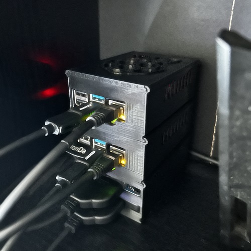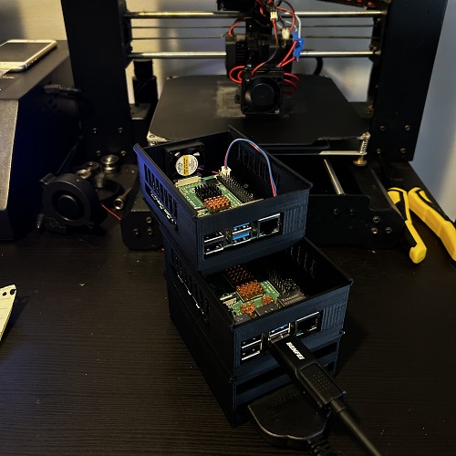 With these requirements in mind, a cluster of single-board computers was born. After designing a modular case in Autodesk Inventor, Proxmox was installed on two nodes. Each single-board computer costs ~70$, providing eight cores and 16GB of RAM for 140$ total. Each Raspberry PI added to the cluster uses roughly, at full load, $4-5/year in electricity cost.